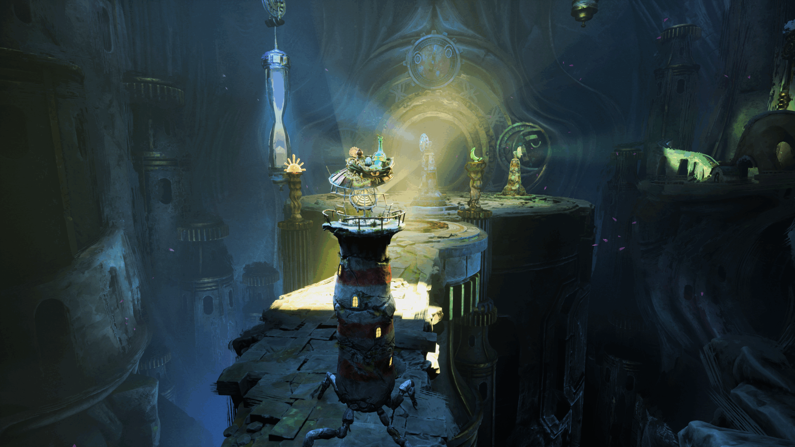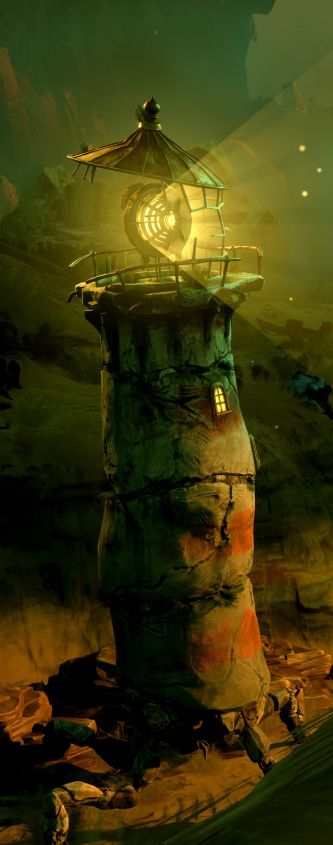 Con estas premisas, veremos una paleta de colores muy bien diseñada por escenario, donde parece que estamos ante cuadros vivos y dentro de una película de animación. Las animaciones del entorno también están fantásticas, ya que el entorno reacciona a nuestro paso y a nuestra luz. ¡Porque somos un faro!, ah, sí, que no lo hemos dicho, bueno, un faro y… ya lo iréis viendo. Merece la pena que no os cuente nada. La cosa está en que nuestra luz de faro realiza varias acciones y el entorno reacciona con ella, como por ejemplo hacer que las plantas florezcan, etc… así que imaginaros el efecto que puede tener en algunos sitios como cuevas con plantas bioluminiscentes o setas de vivos colores… Creedme, este juego es un espectáculo visual. Los escenarios variarán en función de nuestro paso por la aventura, y en algunos escenarios pelearemos con las inclemencias del tiempo u otros factores, que nos mostrarán zonas muy perturbadoras con decorados fríos, oscuros y tormentosos, porque ya os adelanto que el contraste entre las zonas de gran belleza y las zonas que nos van a generar desasosiego, está muy marcado. Os ponemos algunas imágenes, que de seguro no hacen justicia a la realidad, pero os haréis una idea.